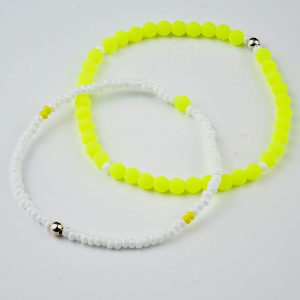 Diese beiden auffälligen Armbänder sind das perfekt Duo. Auffällig, weil diese wunderschönen Neonperlen aus Glas (nicht aus Kunstoff!!!!) bei Helligkeit sofort ins Auge fallen und es Freude macht, sie anzusehen und zu tragen. Da sie sehr zart sind, können sie gut mit anderen Schmuckstücken kombiniert werden, je nach Lust und Laune.