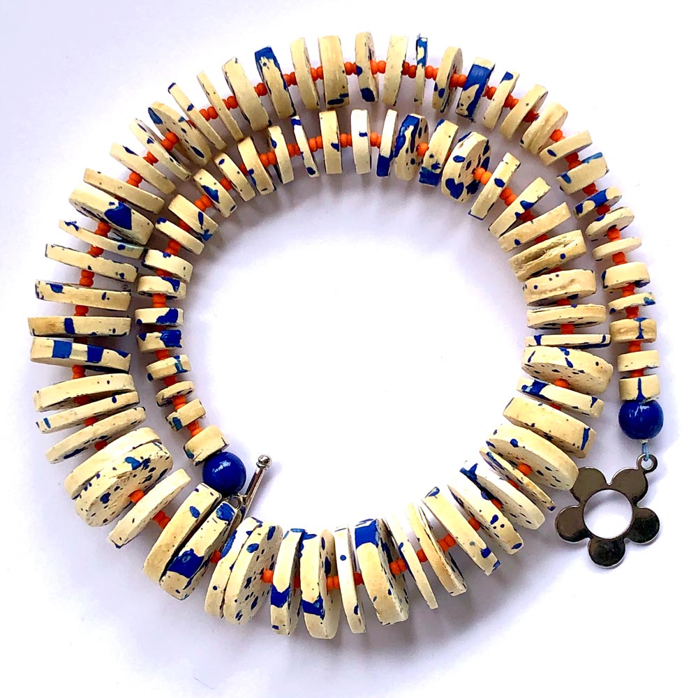Diese künstlerisch gestaltete Halskette erhielt ihr Muster durch das Zufallsprinzip. Gestaltet wurde sie in erster Linie durch Holzscheiben, die im Verlauf gefädelt wurden. Dazwischen habe ich winzige, japanische Glasperlen gesetzt um somit einen Kontrast und einen erkennbaren Rhythmus zu erzeugen.