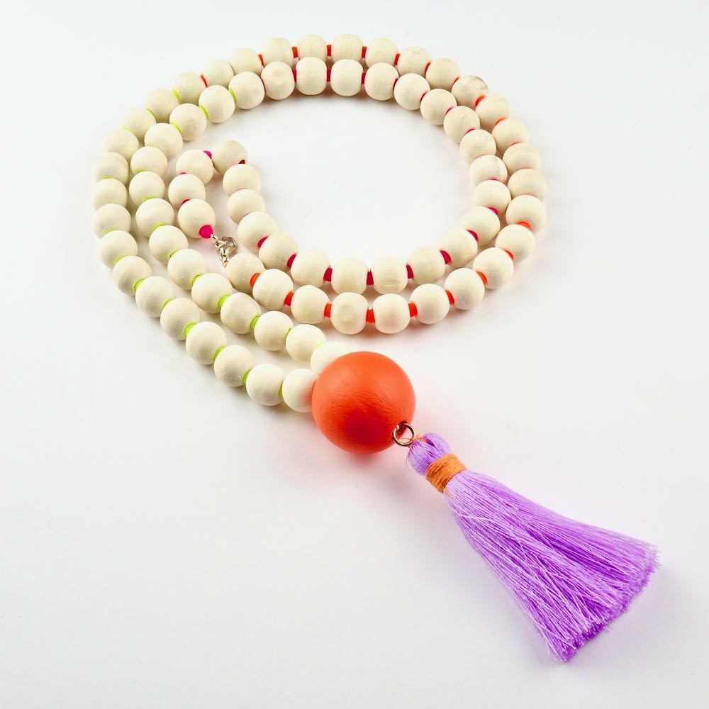Zwei weitere Akzente unterstreichen die harmonische Spannung: eine große, orangefarbene Holzperle und eine handgefertigte Quaste, die dem Design eine individuelle Note verleihen. Das Ergebnis ist ein außergewöhnliches Schmuckstück, das durch seine klare Linienführung und den bewussten Einsatz von Kontrasten besticht.